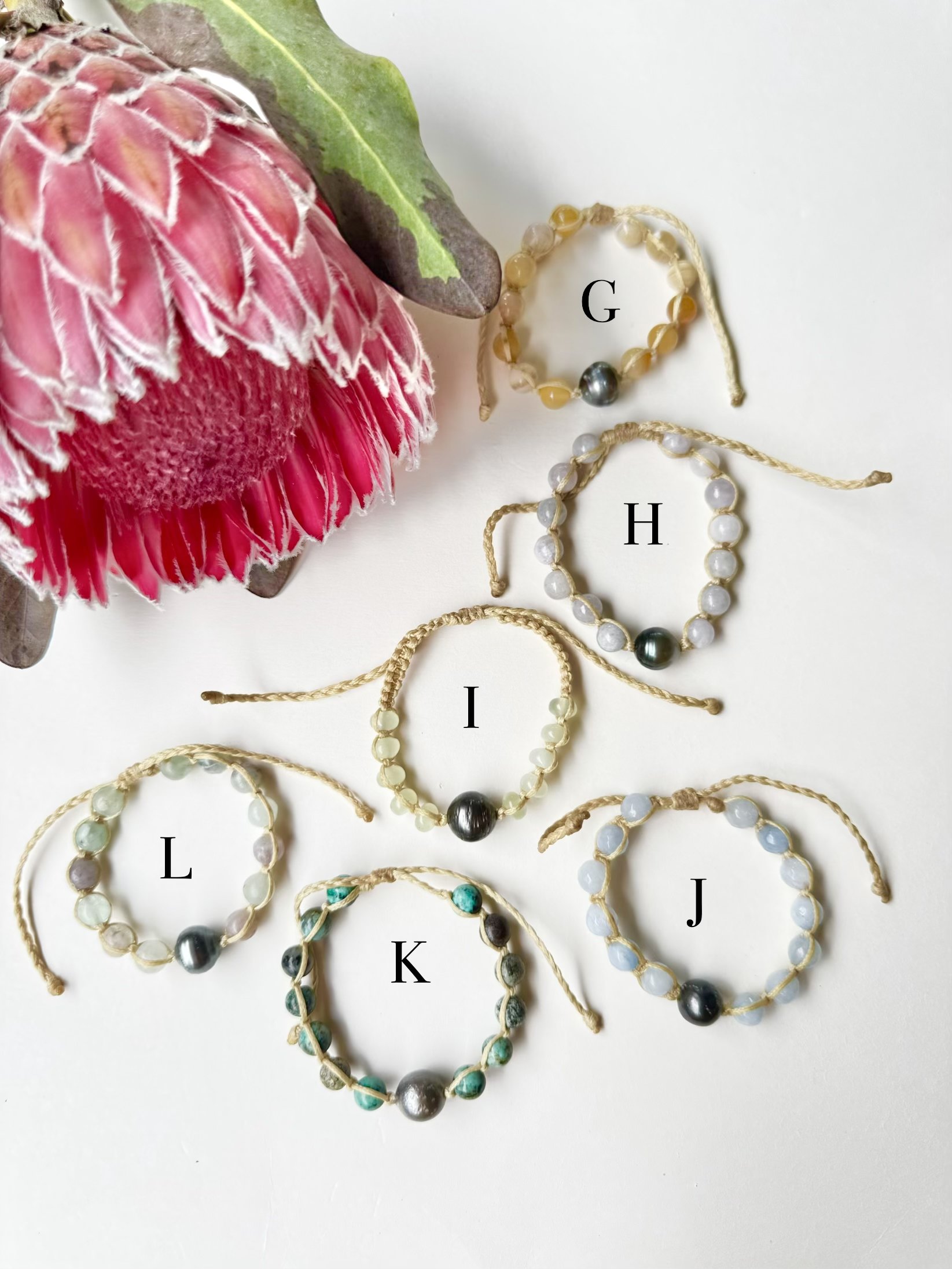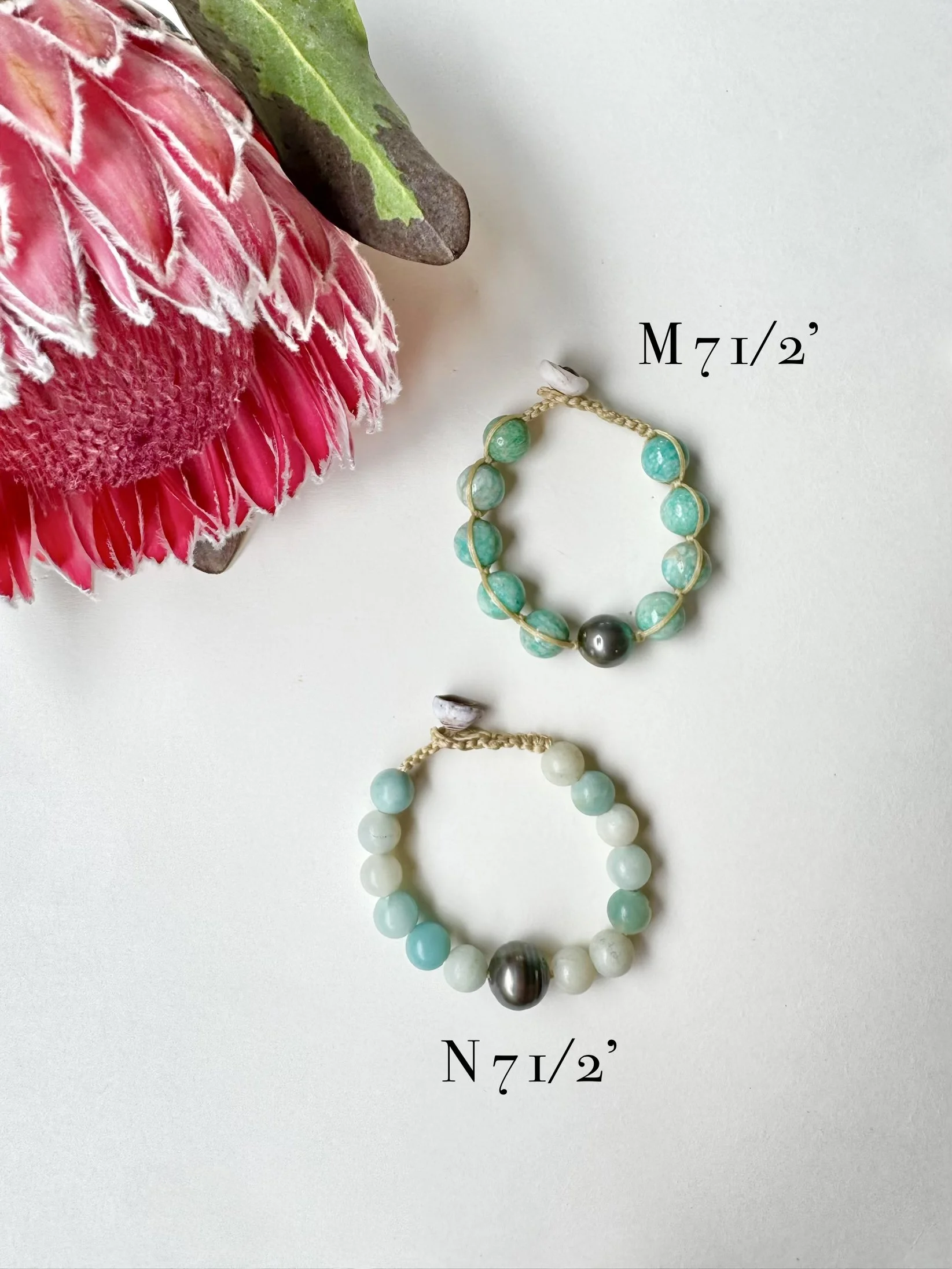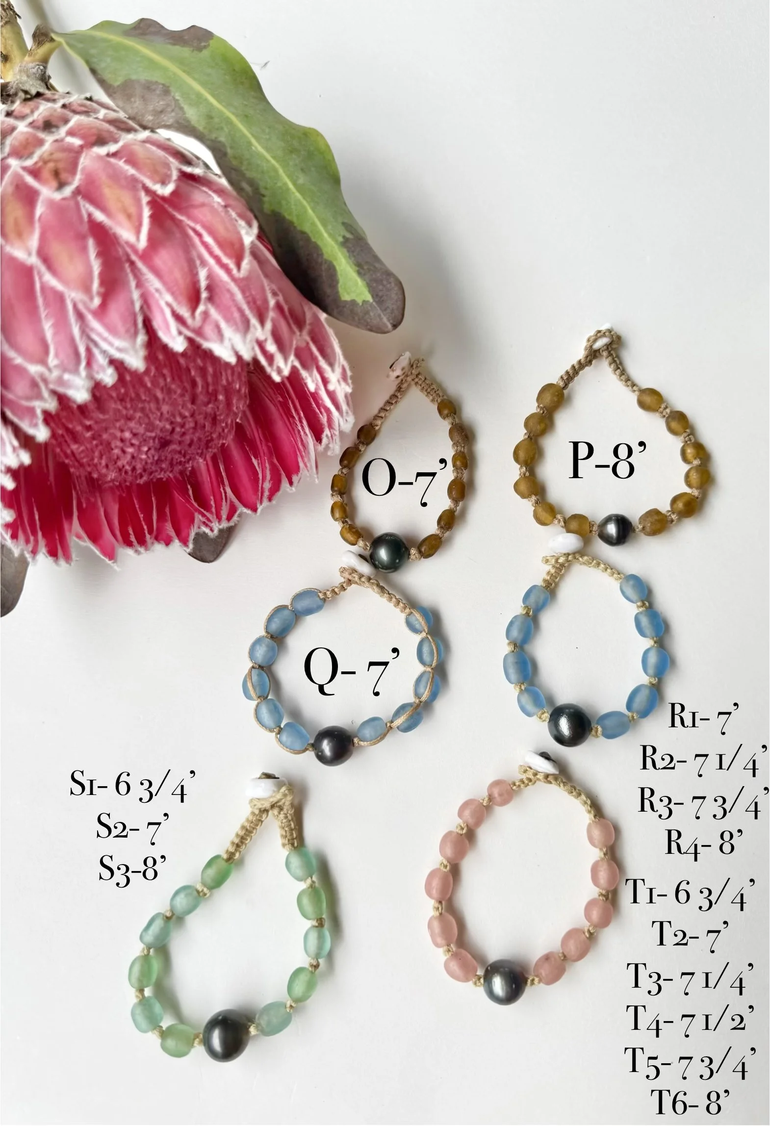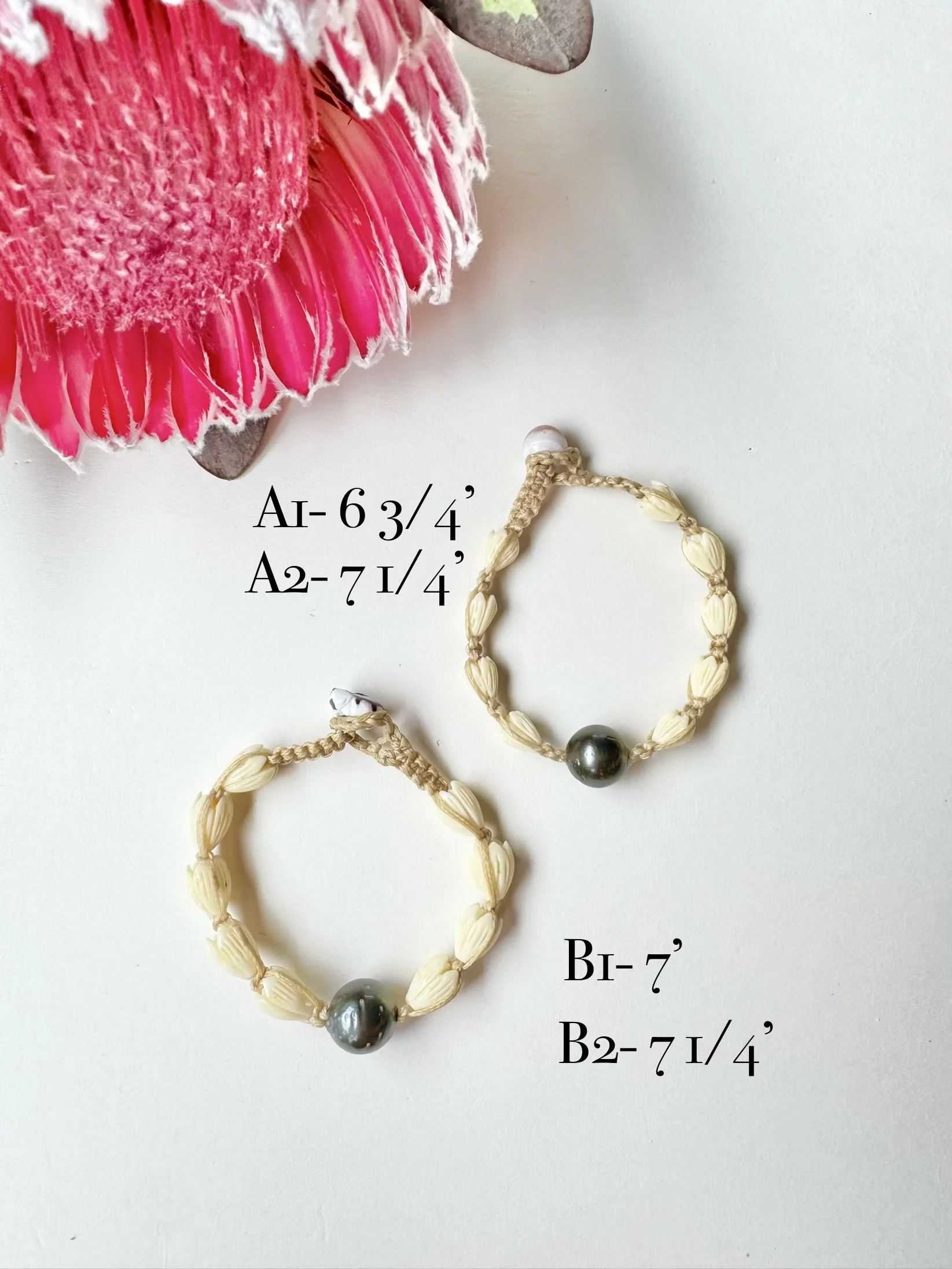 Option A – Features smaller pikake (resin) beads with a single Tahitian pearl on waterproof macramé cording, finished with a secure puka shell clasp.